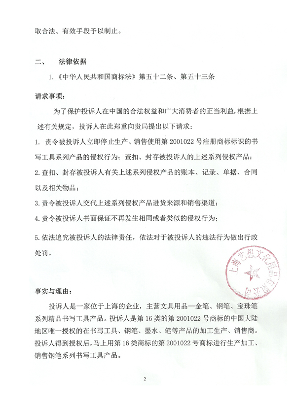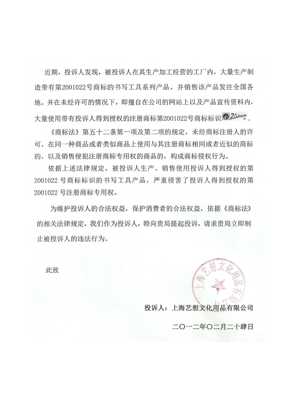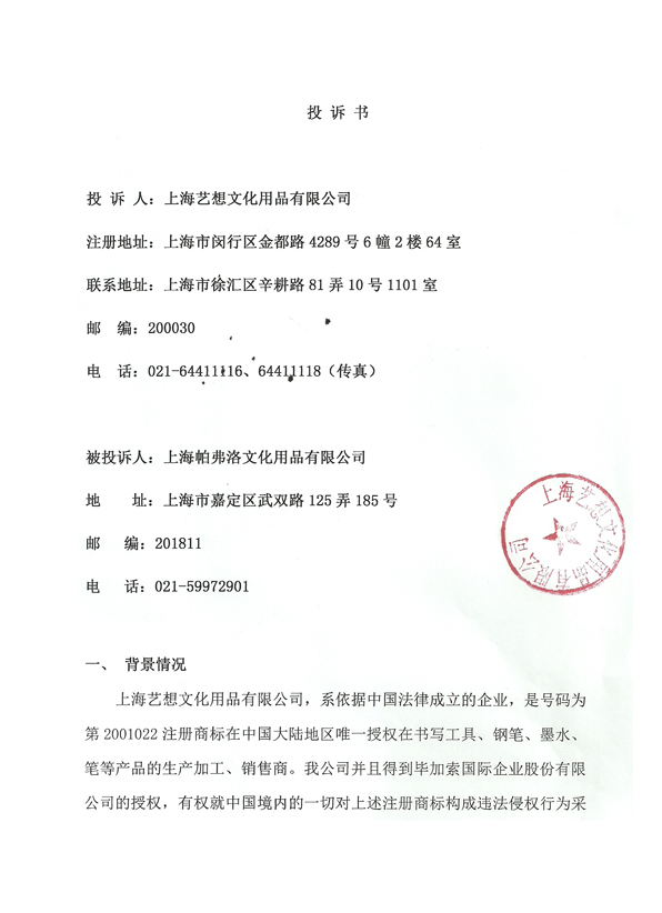 毕加索国际企业股份有限公司2012年2月10日到上海嘉定工商分局投诉上海帕弗洛文化用品有限公司