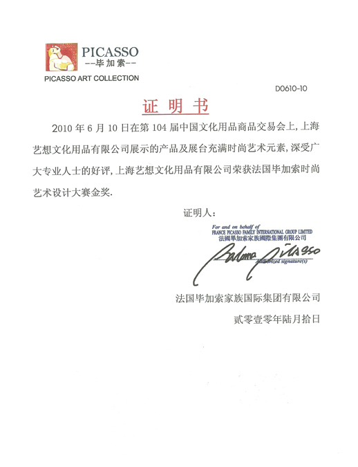 2010年6月11日 荣获法国毕加索时尚艺术设计大赛金奖