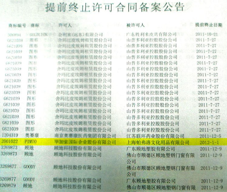 帕弗洛公司被提前终止商标使用许可合同备案公告